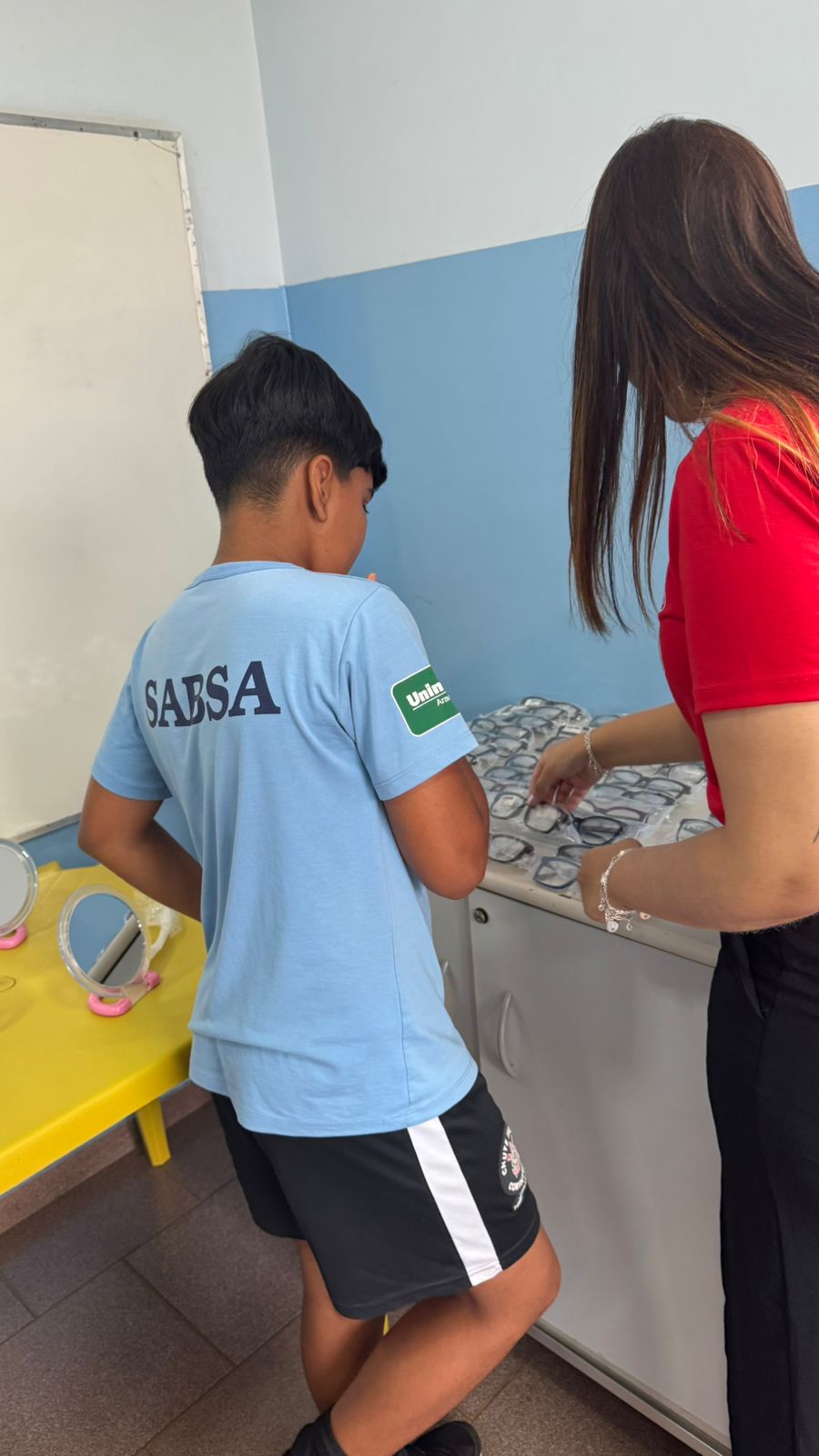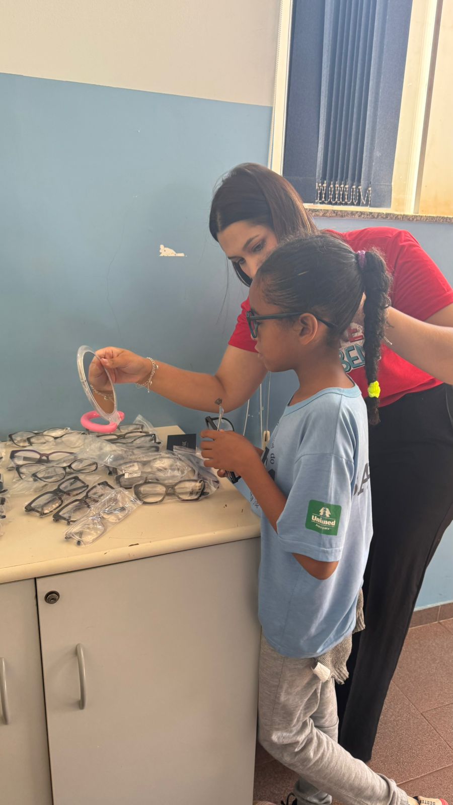 Na triagem, foram identificados dificuldades visuais e encaminhados para a consulta. Aqueles que apresentaram necessidade de correção visual (em consulta) foram orientados, experimentaram modelos de óculos e escolheram a armação que se identificaram. Os óculos de grau, foram fornecidos gratuitamente por meio da parceria com a ABRINQ e Mercadão dos Óculos.